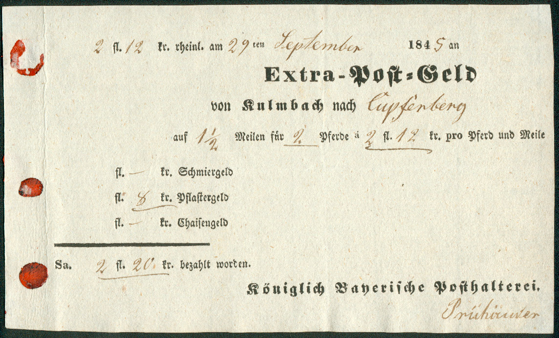 Sie ist für 2 Pferden von Güstrow nach Teterow vom 28.9.1848.Die Strecke betrug 4 1/4 Meilen und das ganze kostete 3 Schilling.