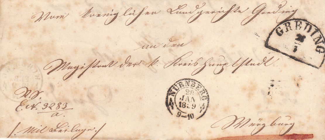 Einen aus Greding nach Würzburg vom 26.1.1859 möchte ich noch zeigen, der zwar nur ein "langweiliger Dienstbrief" ist, aber doch eine kleine Besonderheit aufweist. Vlt. kommt ein Knobler dahinter?