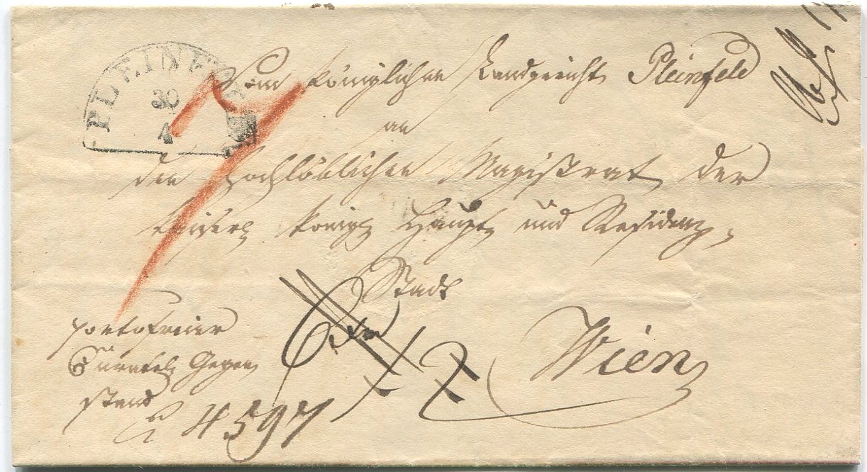 Ich würde dein Pleinfeld Brief anders beschreiben. Es ist 6 Xr 1/2 geschrieben. Also halbes Porto 6 Kreuzer. Dazu kam einen Kreuzer Botenlohn. Es gibt in meine Sammlung ein ähnlicher Brief.