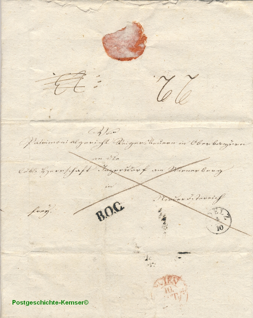 Letztere kosteten, wenn der Brief selbst einfach wog (bis 8,75g), immer mit dem Muster die nach dem Tarif treffende einfache Taxe, hier also 15 Kr., bei höherem Gewicht jedoch nur ein Drittel der weiteren Gebühr.