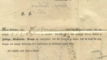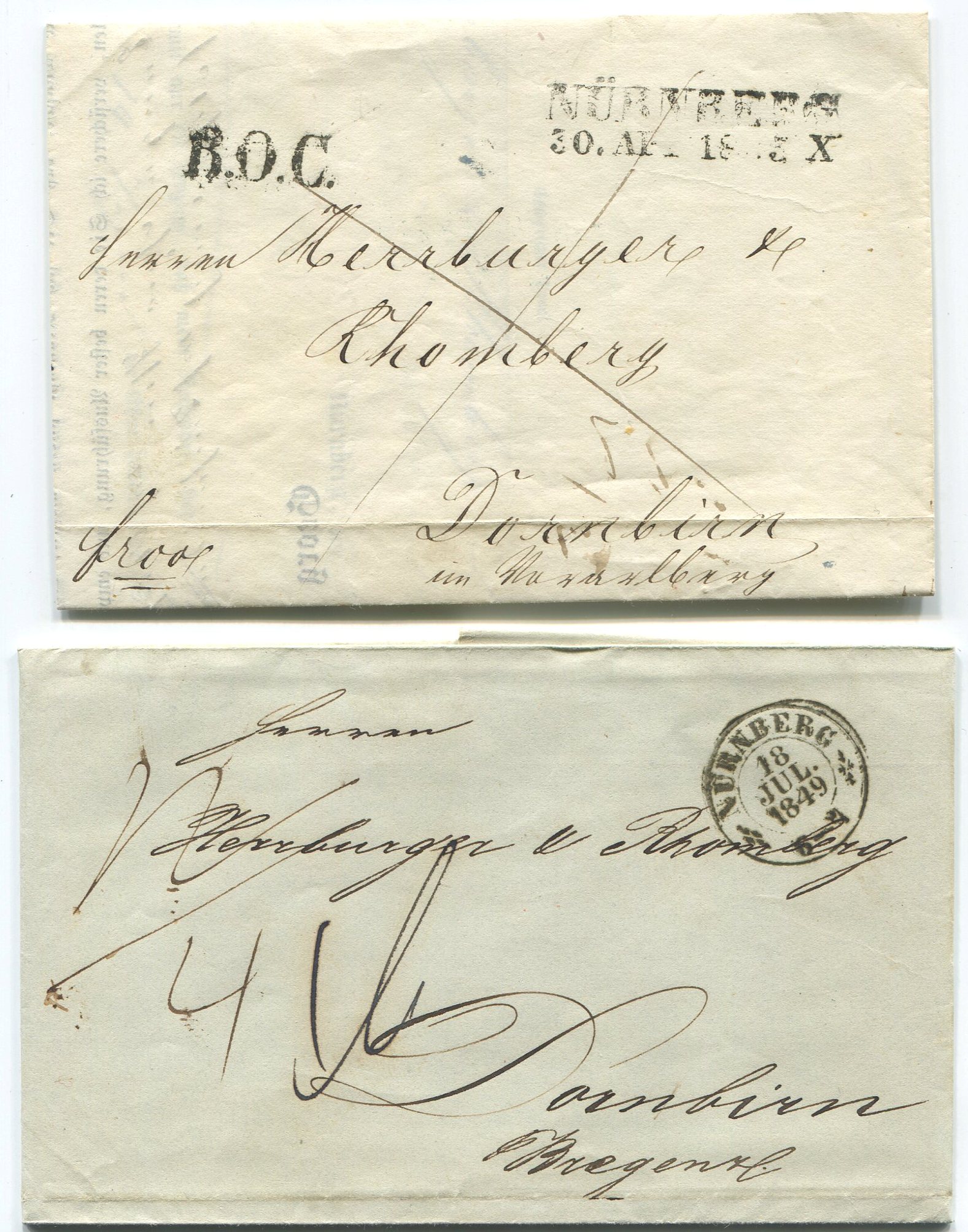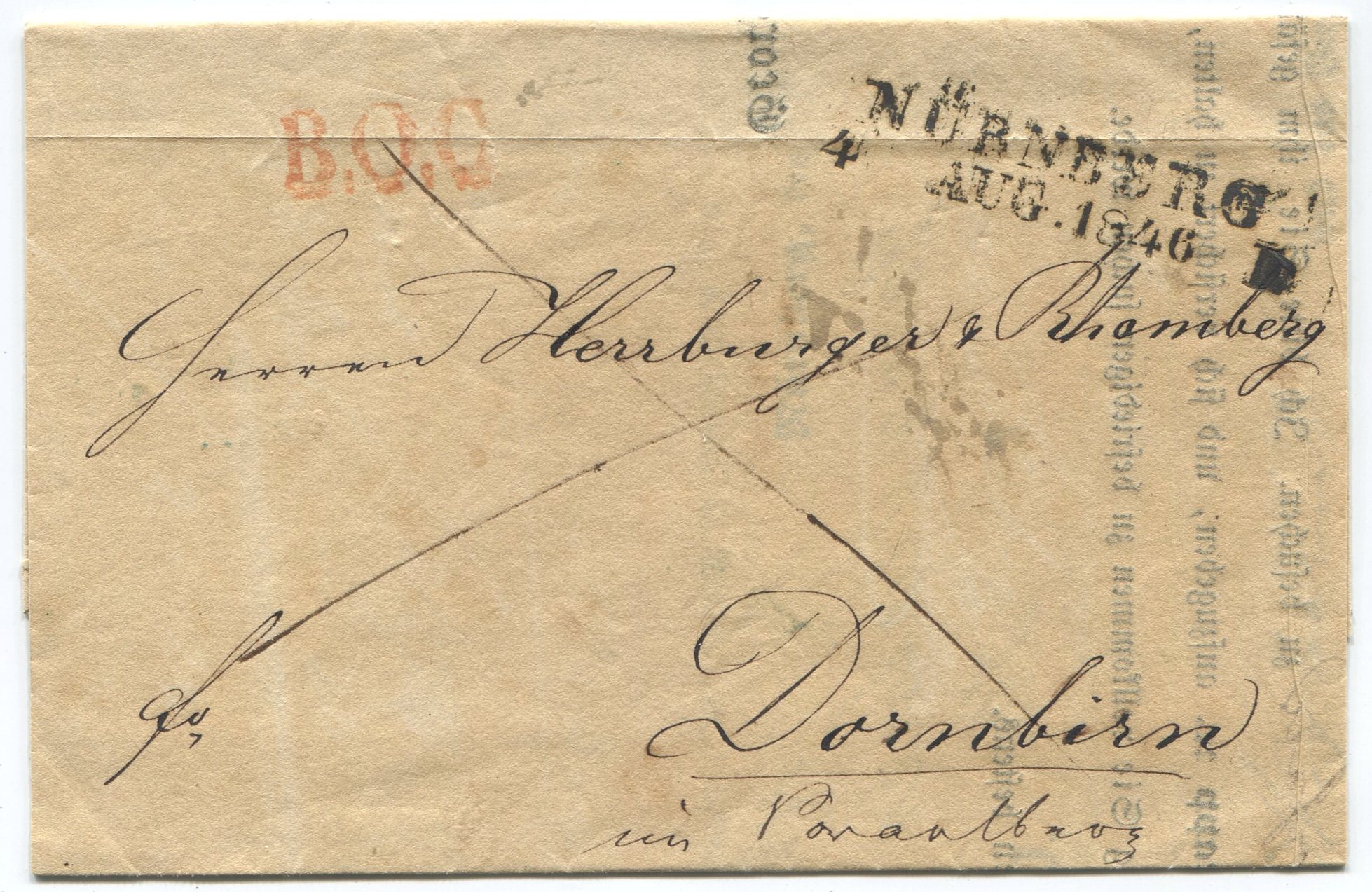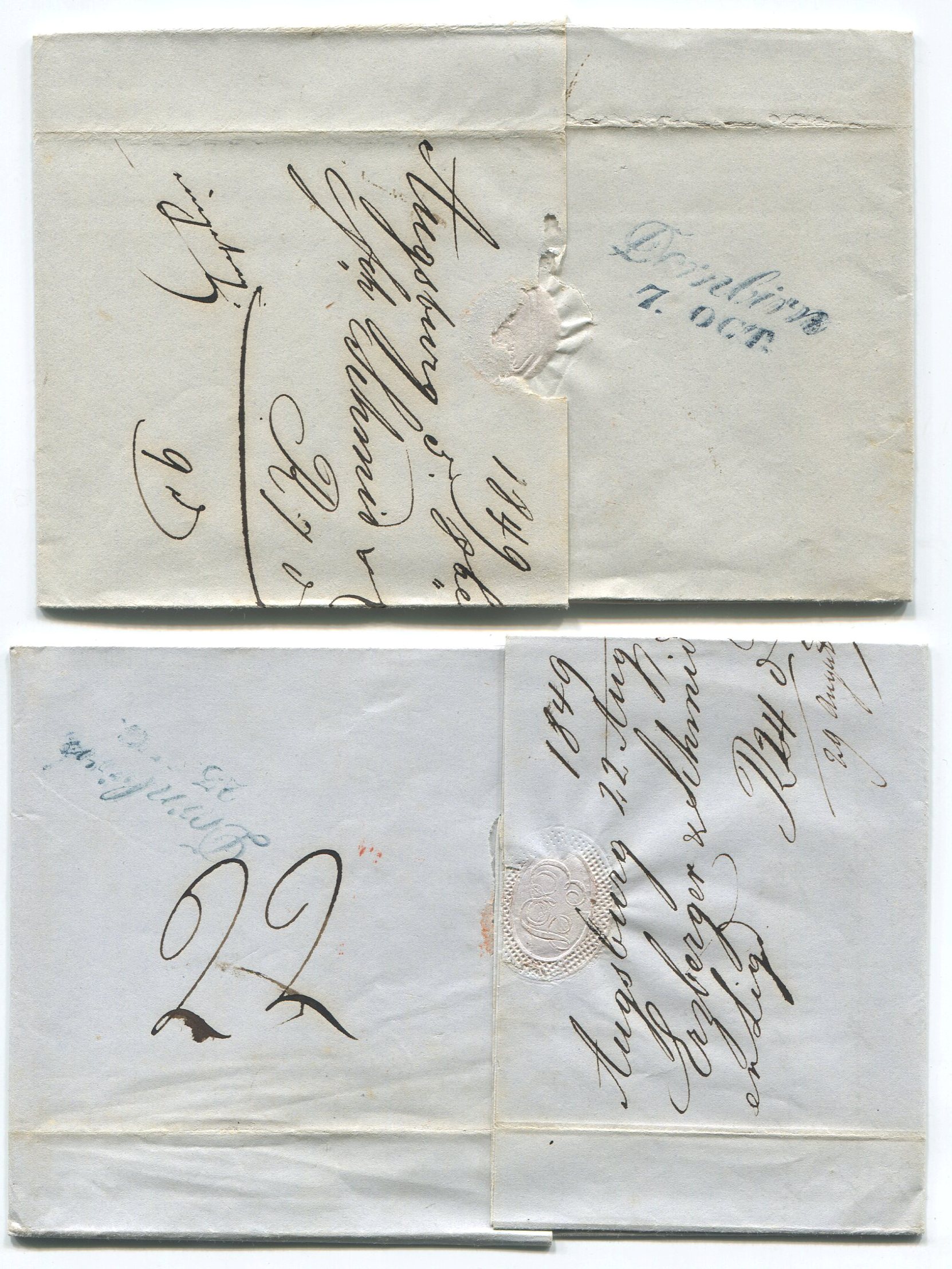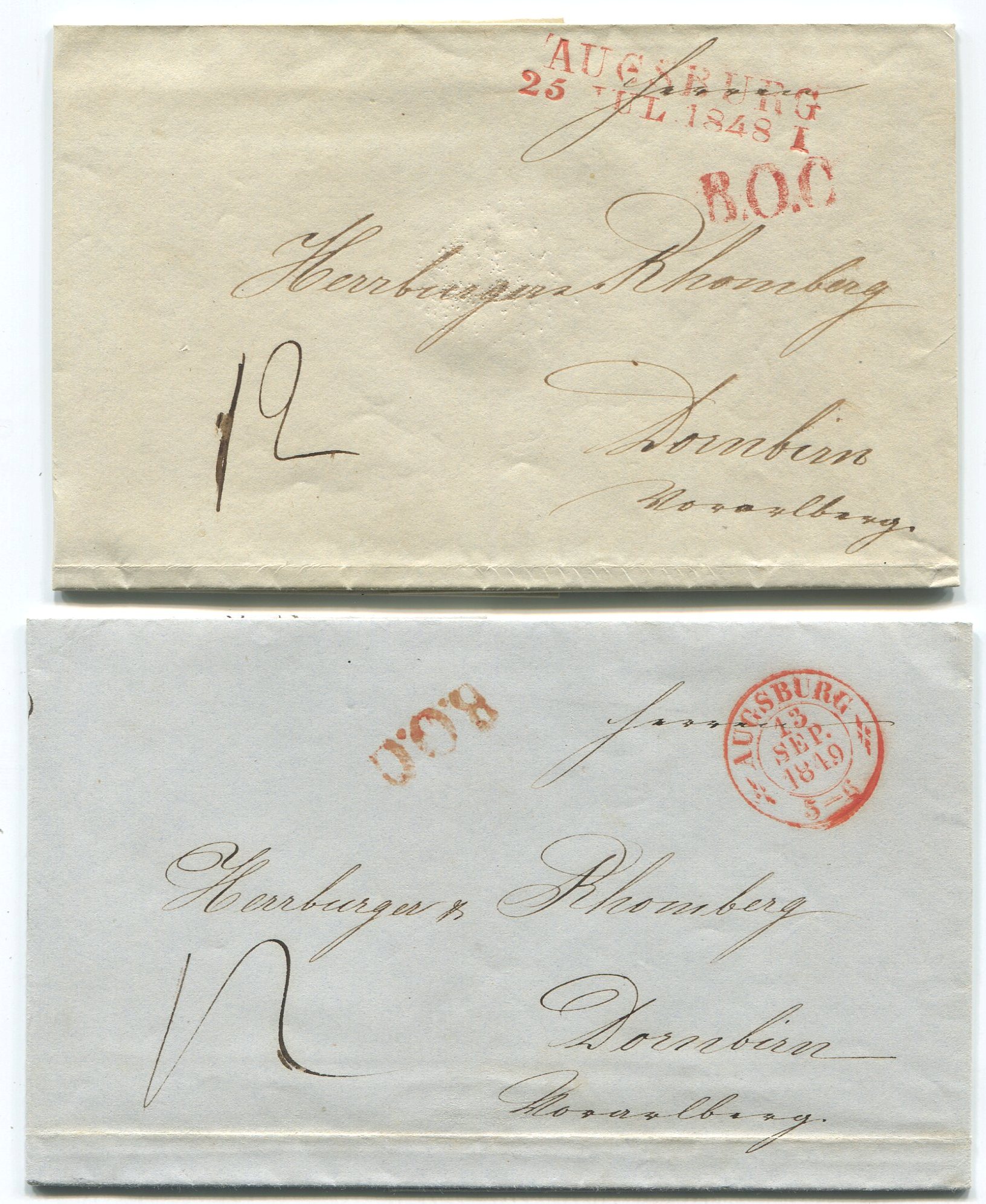 1) Von Wien (6.7.1843) über Augsburg (9.7.1843) nach Harburg bei Nördlingen. Augsburg ging mit 15 Kr. in Auslage. 1. Gewichts und 2. Entfernungsstufe. Schwarzer O.B.C.