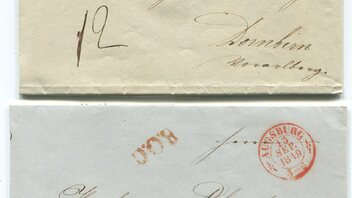 2) Von Passau (24.1.1843) nach Botzen (28.1.1843). 12 Kr. CM 1. Gewichts und 2. Entfernungsstufe. 2-fach abgeschlagener schwarzer B.O.C. Hat die rote 24 auf der Rückseite eine Bedeutung?