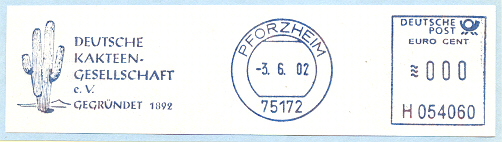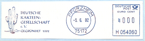 Kakteenmotiv-Freistempel der Deutschen Kakteen-Gesellschaft in alter roter Farbe und in neuer blauer Farbe.