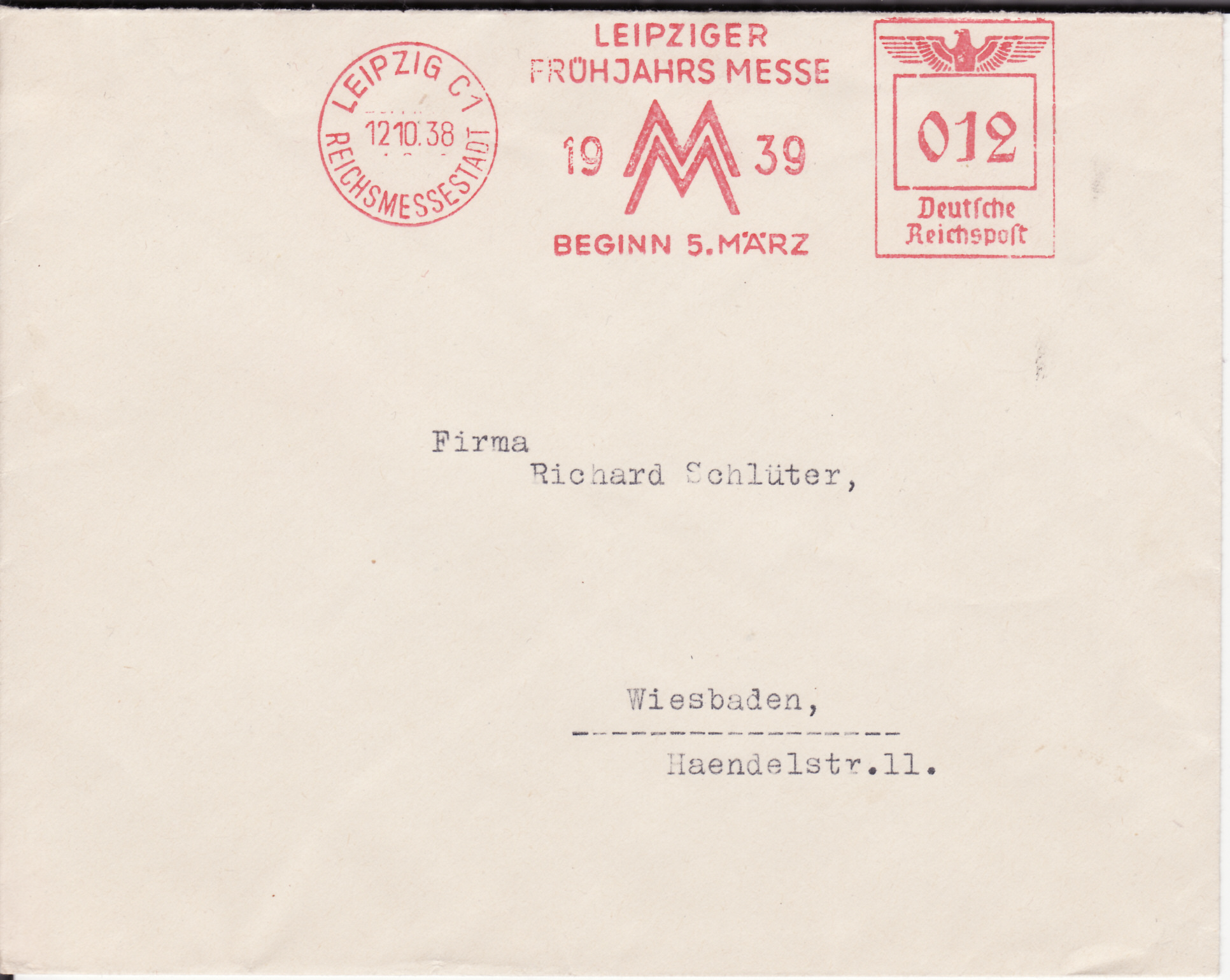 wieder mal ein Beleg aus Leipzig vom 12.10.1938. Diesmal ist es ein Absenderfreistempel vom Leipziger Messamt mit Werbeeinsatz für die Frühjahrsmesse 1939.