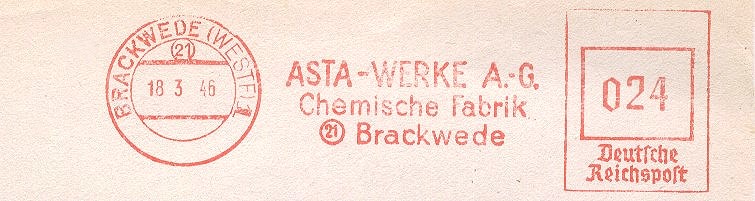 hier ein Freistempel aus dem Jahre 1946 aus Brackwede (das jetzt zu Bielefeld gehört). Der Stempel stammt noch aus der Reichspost-Zeit, in dem Wertrahmen wurde der Reichsadler eliminiert.