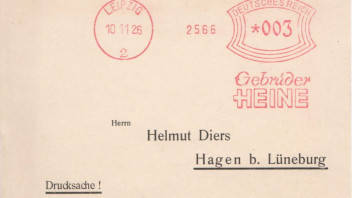 hier eine Drucksache mit 3 Pfennigen vom 10.11.1926 der Firma Gebrüder Heine aus Leipzig. Ein alt eingesessenes jüdisches und weltweit führendes Tuchhandelshaus. Mit der Arisierung 1938 wurde daraus die Tuchhandels AG. Was mit der Firma nach dem Krieg geschah, habe ich auf die Schnelle nicht ermitteln können.