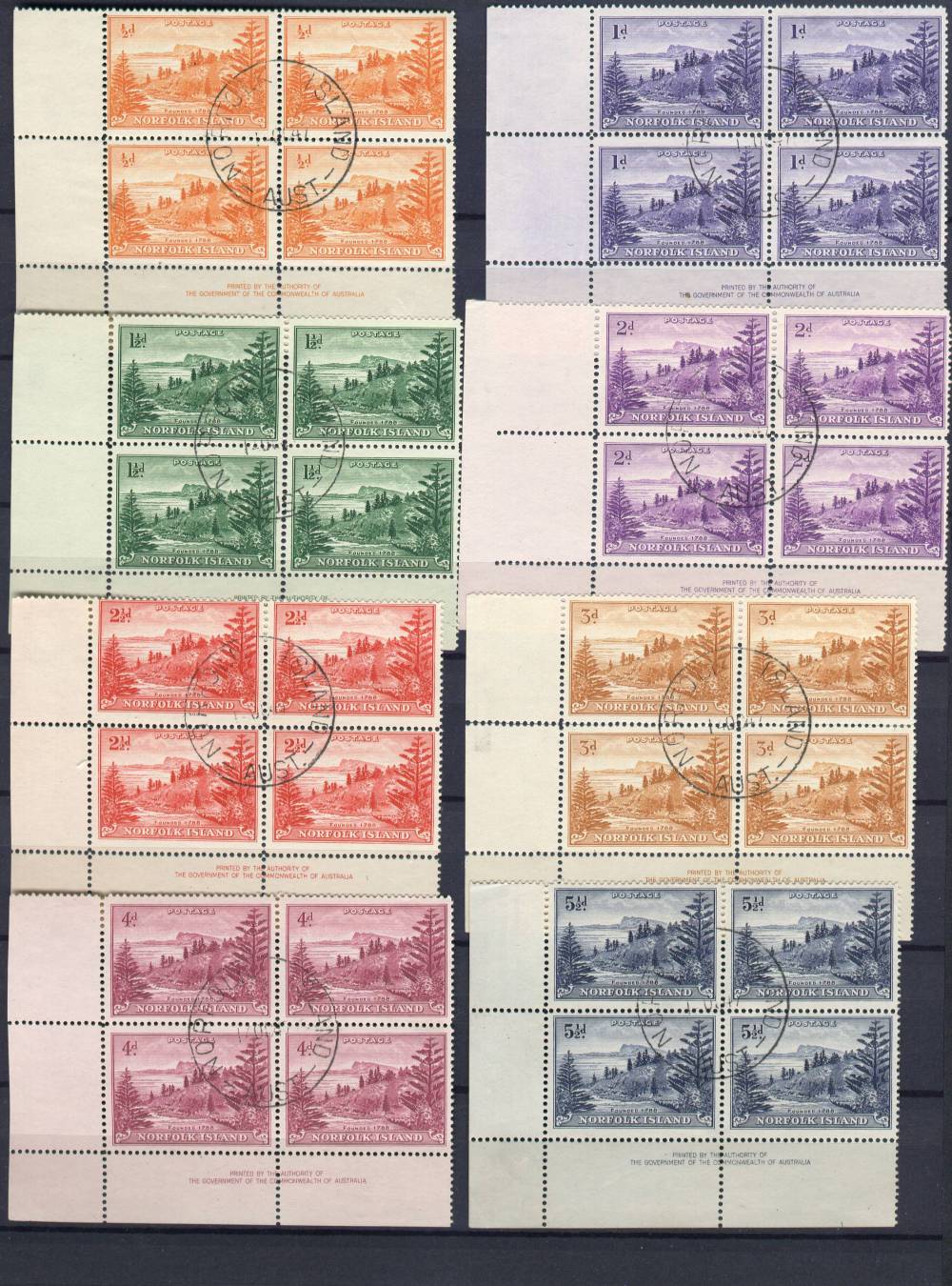 Es handelts sich um Mi. 1x, 2x, 3x, 4x, 5x, 6x, 8x, 9x, 10x 11x 12x und 13x auf "gelblichen" Papier mit Druckvermerk "Printed by the Authority of the Government of the Commonwealth of Australia". Man beachte wie schön bei diesen Blocks die unregelmäßigkeit der Linienzähnung bei den Ecken rüberkommt. Wunderschön ersichtlich ist auch, dass die Terminologie "gelbliches Papier" absolut unangebracht ist, man betrachte mal das Papier der grünen 1½d Marken von vorne.