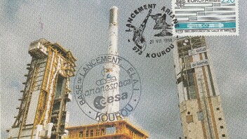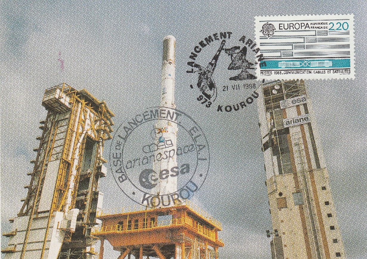 Dazu passt philatelistisch perfekt diese Karte zum Thema Ariane V 24, einer Ariane-3, die als Nutzlast INSAT 1C sowie ECS 5 (=EUTELSAT I F5) trug, mit zwei thematisch passenden Stempeln!