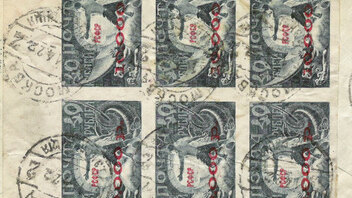 Frankatur Sechserblock der Ueberdruckmarke 10.000p.
