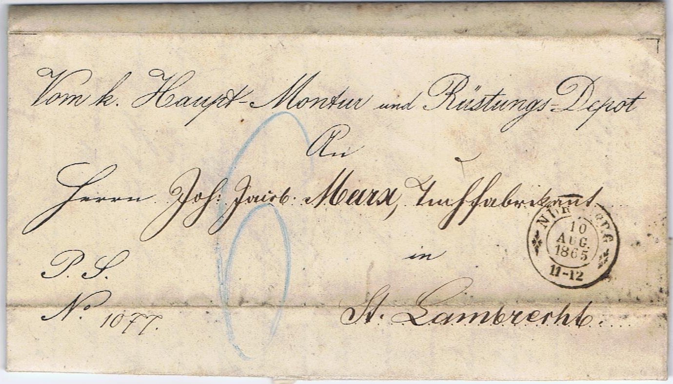 Auch von mir mal wieder was ohne Marken. Ein Brief vom königlichen Haupt-Montur und Rüstungs-Depot in Nürnberg an Herrn Marx in Lambrecht vom 9.August 1865. Abgeschickt wurde der Brief am 10.08., angekommen in Lambrecht ist er am 11.8.