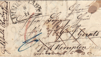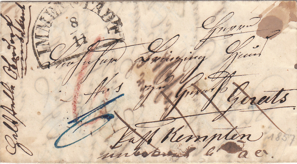 Da in Immenstadt am 8.11.1857 nicht frankiert wurde, taxierte man ihn mit Rötelstift (war in Schwaben die Regel, sonst eher die Ausnahme) mit 6 Kr. als einfachen innerbayerischen Brief bis 12 Meilen. Der Adressat wohnte in Gerats, Post Kempten, heute Waltenhofen. Das waren ca. 20 km.