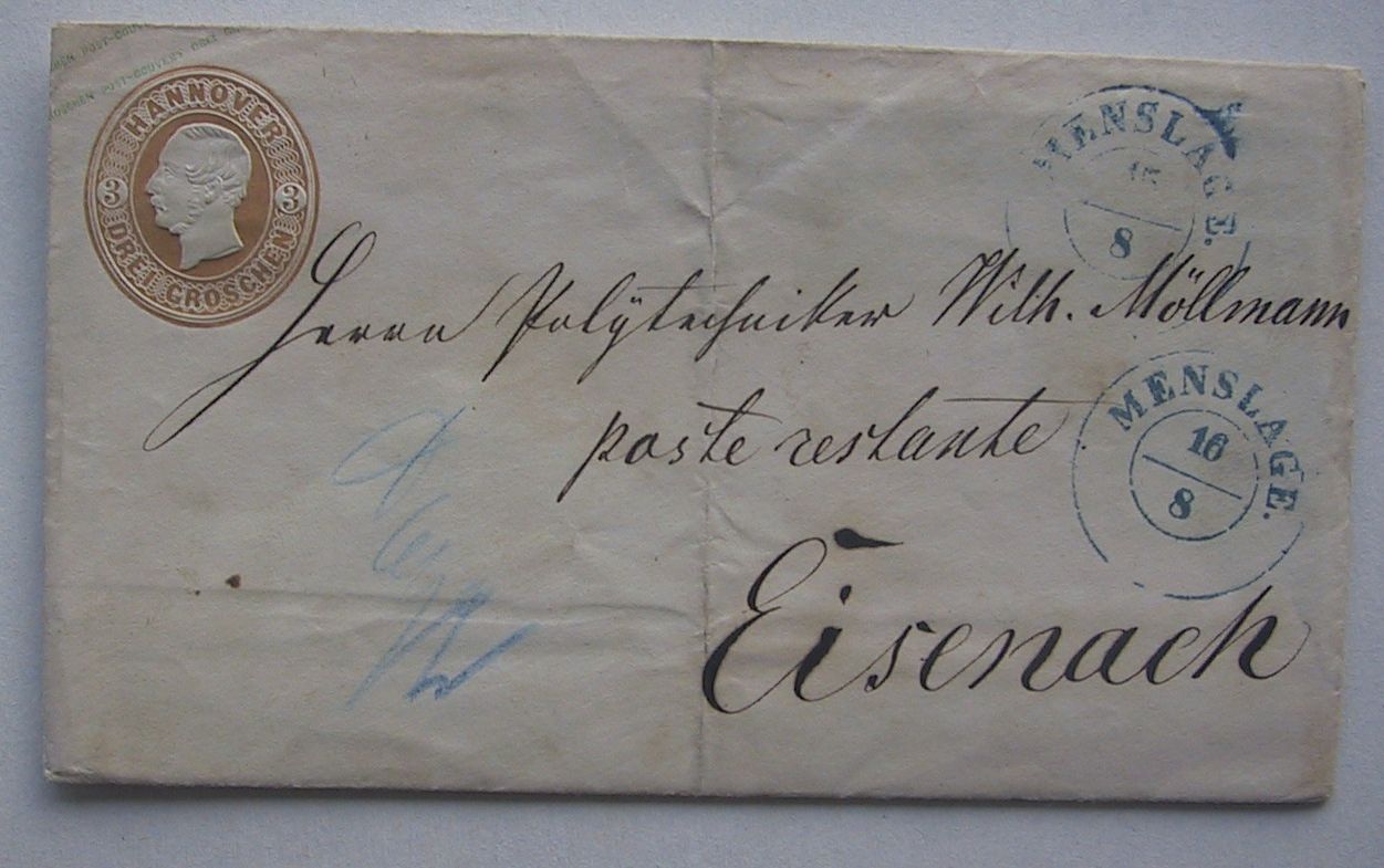 Ich finde es schade, das aus dem Bereich Hannover so wenige Ganzsachen und Briefe mit Marke hier gezeigt werden. Da möchte ich weitermachen mit einer 3 Groschen Ganzsache von Menslage nach Eisenach. Der Stempel Menslage ist allein schon relativ selten und dann noch auf einen poste restante Brief nach Eisenach an Herrn ????? Wilhl. Möllmann Der Brief wurde am 22. Sept 1864 geschrieben.