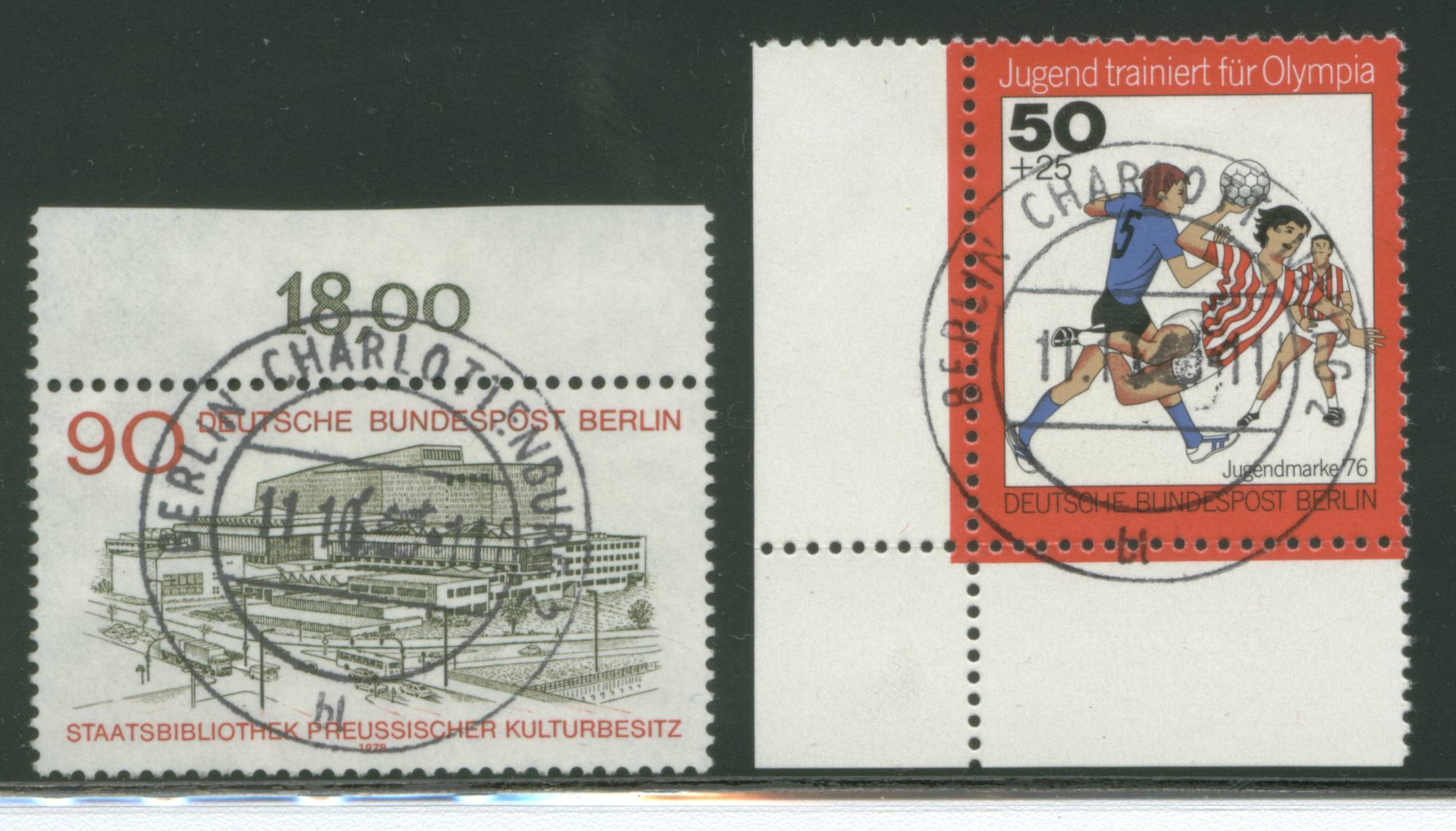 Hier im Bild zeige ich die Stempel von Essen und Presseck, jeweils mit dem Unterscheidungsbuchstaben „zz“. Das sind Stempel von Postagenturen, die erst nach Inbetriebnahme der Briefzentren bzw. Einführung der 5-stelligen Postleitzahl eröffnet wurden. Diese Stempel mit den doppelten Buchstaben aus dem hohen Alphabet beginnend mit z, y oder x sind allesamt mit der 5-stelligen Postleitzahl versehen, die natürlich immer geschickt nicht mit auf der Marke abgestempelt worden ist. Da ja allgemein bekannt ist, dass Berliner Marken am 31.12.1991 ihren letzten Gültigkeitstag hatten, sind diese Stempel rückdatiert worden und somit die Marken komplett wertlos geworden. Warum wohl sonst ist die Marke mit dem Unterrandstück quer gestempelt worden? Es ist erschreckend, welche Massen an Marken mit solchen falschen Stempeln auf dem Markt im gesamten Bundesgebiet kursieren. Bei einem Sammler habe ich ein komplettes Lagerbuch mit diesem Material gesehen. Dem habe ich die schlechte Nachricht geben müssen, dass alles wertlos sei. Der arme Mann ist vor Schreck ganz blass geworden. Die „Sammlung“ hatte er für viel Geld über eine Auktion bezogen und nun ist alles nichts mehr wert.