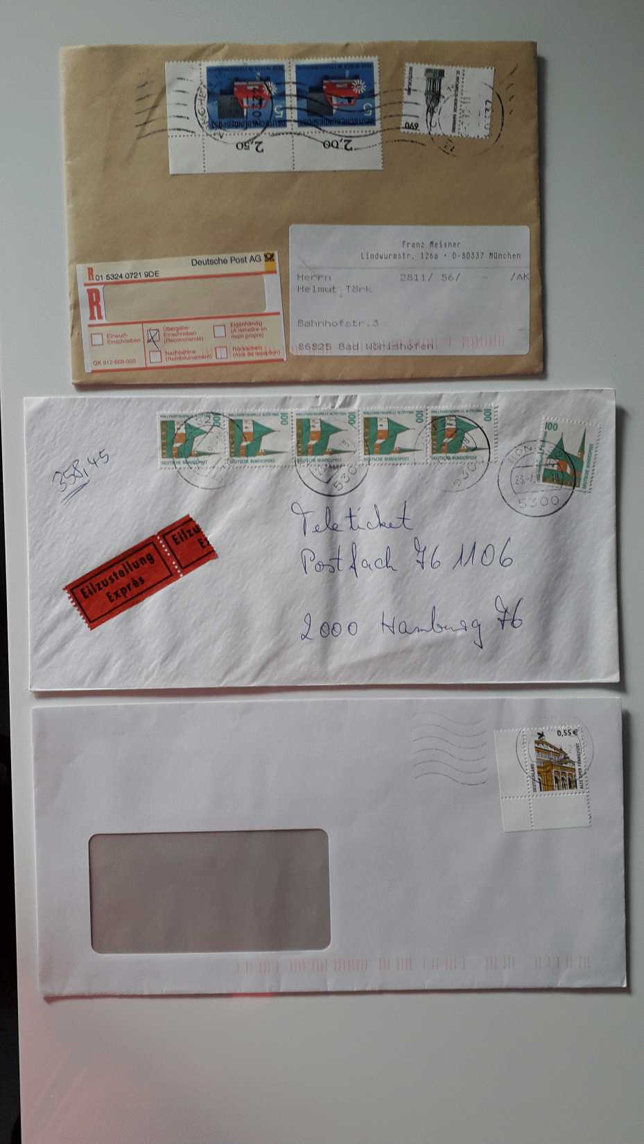 beim "Ausmisten" gefunden: Über 40 Belege mit SWK-Marken. Fast alles Einschreiben, Wertbriefe oder Eilzustellungen. EF, MeF und MiF. Erhaltung unterschiedlich. Hier ein Bild mit drei Beispielen.