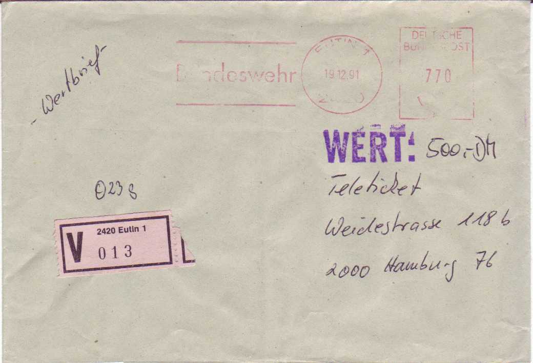 Ein rot freigestempelter Wertbrief von der Bundeswehr.
