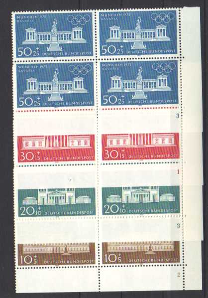 Vierer-Blöcke Michel-Nr. 624 - 627 als Eckrandstücke rechts unten mit Formnummern: