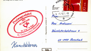 Mit der Postkutsche befördert, siehe Zusatzstempel "P0stwagenfahrt" anläßlich der Olympiade 1972 v. St. Gallen nach München. Frankiert mit der 30 Pf BR MiNr 721 und Olympia-SSt. v. 1.9.72, MÜNCHEN 2 b in die Schweiz nach Rorschach. Aber neben den phila. Besonderheiten ist die Vorderseite besonders schön und gehört mit Fug und Recht in diesen Thread.