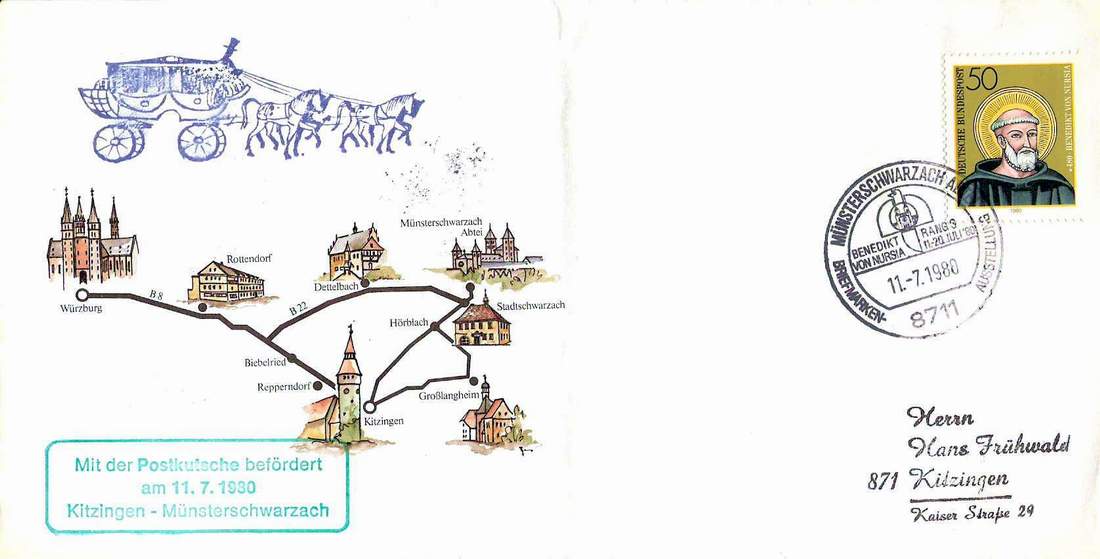Der zweite Beitrag entspricht wieder allen Kriterien: Postillion auf der Marke ( DDR MiNr 2997 I), Postamt im Stempel und Kutsche im Zudruck plus Sonderbeförderungsbestätigung. Kutscher, was willst Du mehr!