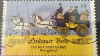 So schöne Straßen waren zur Zeit des Lindauer Boten noch nicht vorhanden und der größere Teil des Weges mußte zu Fuß oder mit dem Pferd zurückgelegt werden. Aber Kutsche muß sein wie hier auf der MiNr 2364
