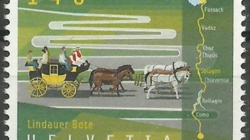 So schöne Straßen waren zur Zeit des Lindauer Boten noch nicht vorhanden und der größere Teil des Weges mußte zu Fuß oder mit dem Pferd zurückgelegt werden. Aber Kutsche muß sein wie hier auf der MiNr 2364