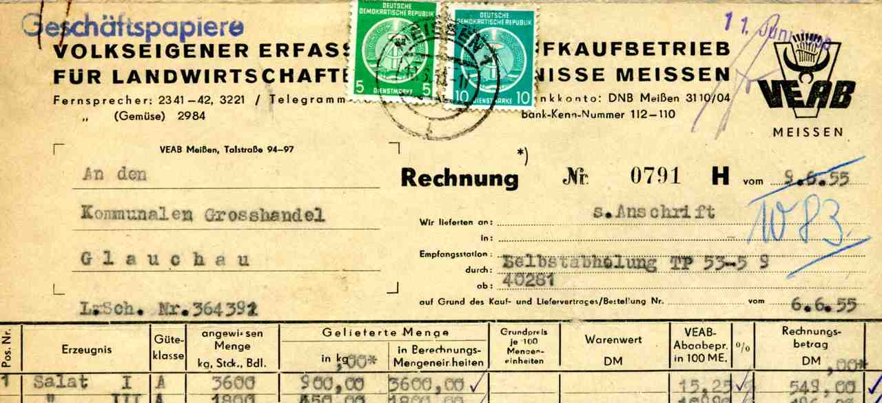 in meiner DDR-Sammlung befinden sich eineige Rechnungen des "Volkseigener Erfassungs- und Aufkaufbetrieb für Landwirtschaftliche Erzeugnisse Dresden". Der Adressat ist der komunale Großhandel in Glauchau. Darauf sind die 5 Pf und 10 Pf Dienst A im Offsetdruck aufgeklebt (Mi.Nr.1,4) und mit Tagesstempel entwertet.