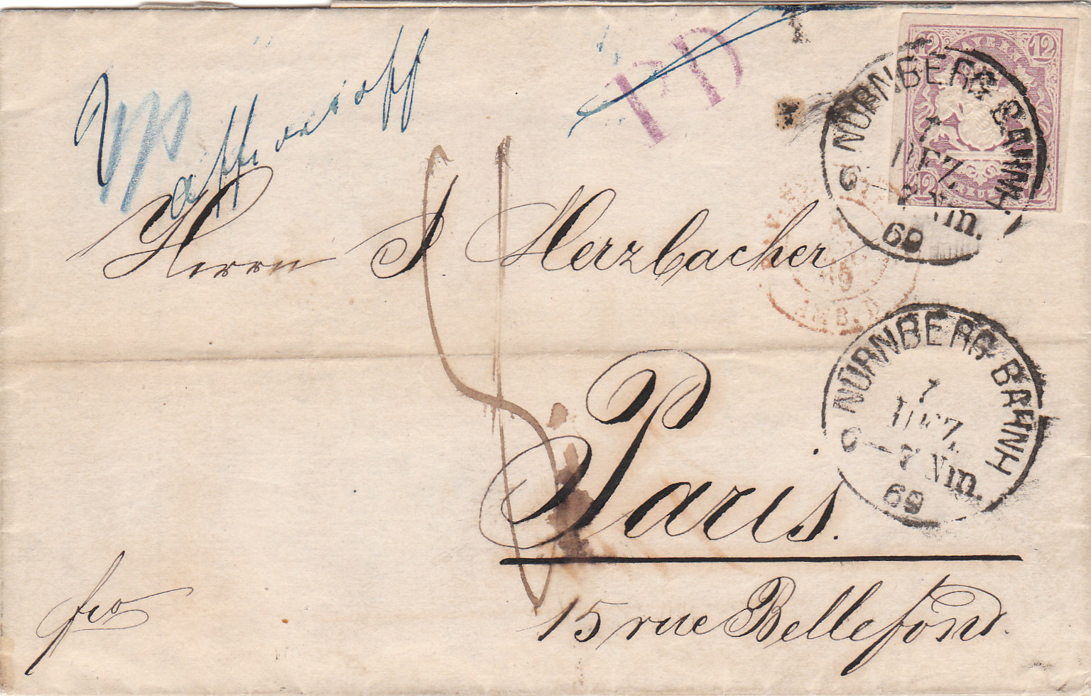 Ein unterfrankierte Brief aus dem selben Büro, der völlig falsch behandelt wurde, datiert vom 7.12.1869. Nürnberg schrieb in Blau "1P" und stempelte bei dem mit 12 Kr. um 12 Kr. unterfrankierten Brief folgerichtig P.D..