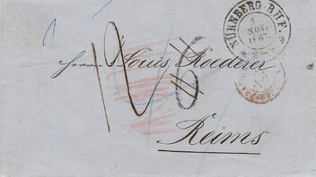 Besser machte es die Hauptbriefpostexpedition Nürnberg am 22.2.1870 bei einem Brief nach Strasbourg, hier jedoch wurde "1 P" in rot mittig notiert.