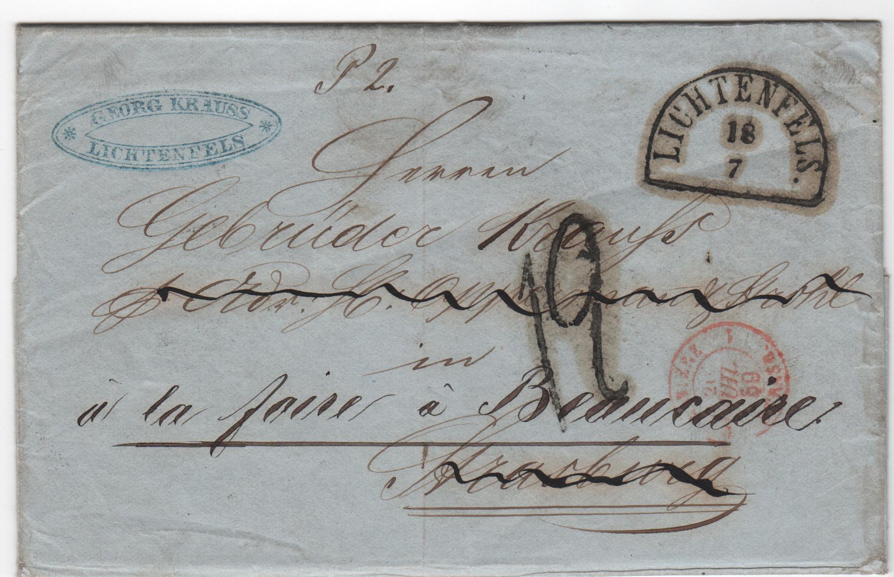 Ein Brief vom 25.10.1865 aus Kaiserslautern nach Reims zeigt uns, dass alles beachtet wurde, nur die Gewichtsangabe wurde vergessen. Natürlich wurde er deshalb nicht nachtaxiert, aber der Vorschrift entsprach das nicht.