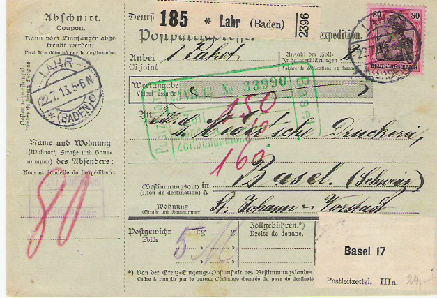 Die P/Karte in die Schweiz gibts zig mal. 80Pfg war die erste Gewichtsstüfe. Sie sind aber nicht zu verachten, weil es nämlich die gute 80Pfg Marken gibt (Mi 93II). Wenn man viel Glück hat, könnte er eventell eine erwischen.