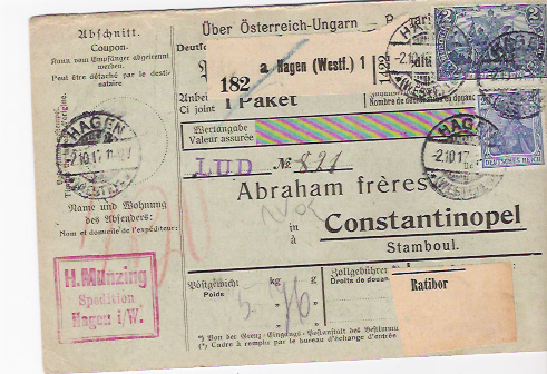 Die Karte nach Konstantinopel ist schon besser. Häufig findet man Türkische Steuermarken (Zollmarken) hintendrauf.