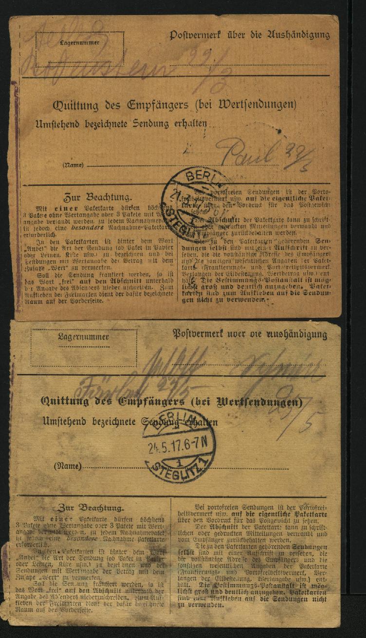 Die grünen Paketnummernzettel gibt es natürlich auch in GROSS :D . Sie kleben dann zusammen mit dem kleinen Abschnitt auf württembergischen Paketen bis 12½kg, die in Württemberg ohne Paketkarte versandt werden konnten.