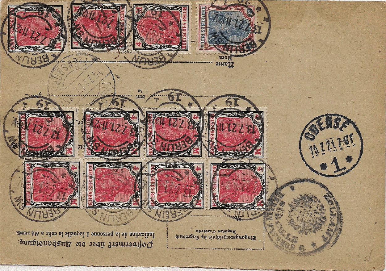 Die Firma Borchardt in Berlin hatte es im Juli 1921 offenbar sehr eilig, ihre Sendung nach Odense zu bekommen, das Paket wurde nicht nur "Dringend" (dänische Bezeichnung: Ilpakke) schnellstmöglich transportiert sondern auch "Per Eilboten" (dänisch: Ekspres) umgehend zugestellt. Porto 47 Mark!