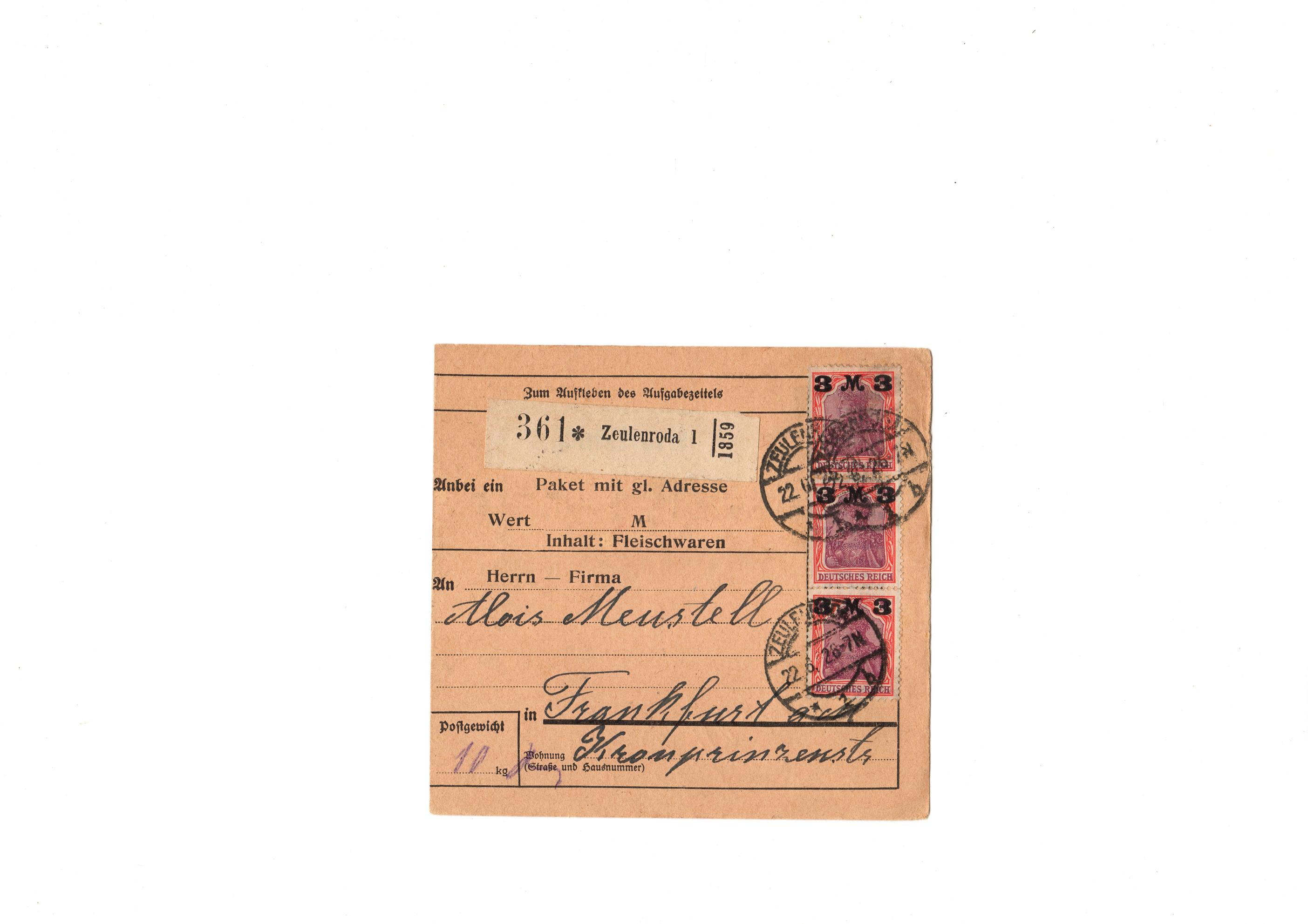 Hier eine Paketkarte gelaufen am 22.06.22 von Zeulenroda nach Frankfurt a. Main Ankunftsstempel 26.02.22 aus der 7. Portoperiode.