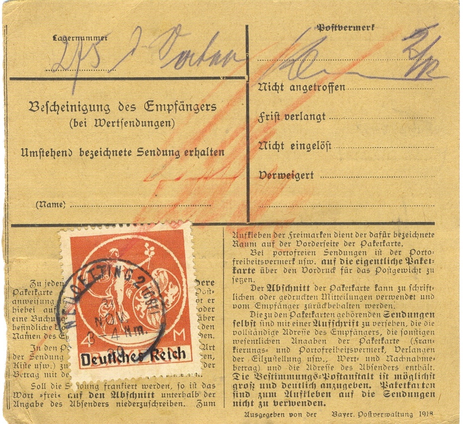 5 mK grünschwarz,karmin, senkrechter 4erStreifen(1 ecke beschädigt)rückseitig mit 2 senk Paaren 1 MK.rot vorder und rückseitig auf Auslanspaketkarte mit Coupon von Velbert/27,11,1920 nach Mexiko