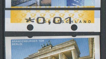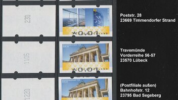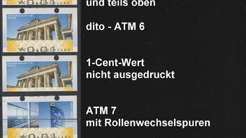 Am linken Bildrand ist eine rote "Schlange" zu sehen. Da muss ich bei der seinerzeitigen Durchsicht der gezogenen Marken aber gehörig betriebsblind gewesen sein, dass mir das nicht vorher aufgefallen ist. Zuerst habe ich an einen Fussel gedacht, den man einfach abwischen kann. Aber dieser rote "Faden" (oder was auch immer das ist) befindet sich im Druck der Marke. Also haben wir mal wieder etwas neues, auf das wir ATM-Sammler achten müssen
