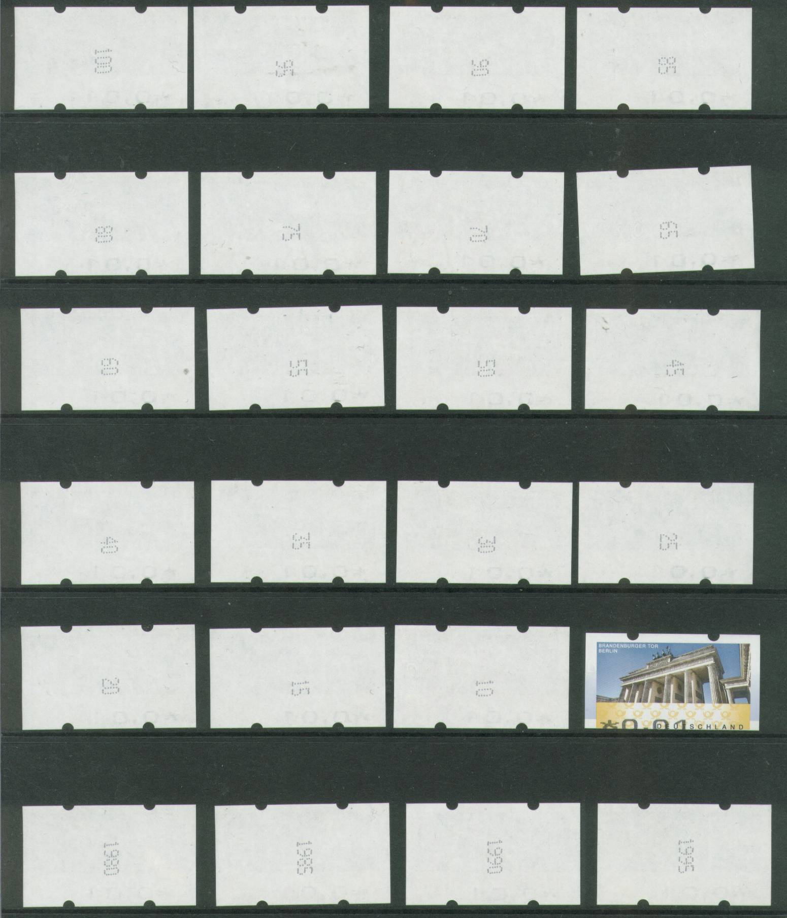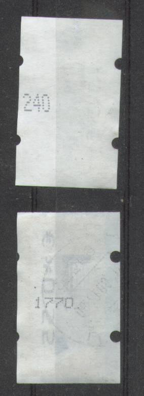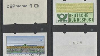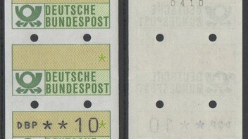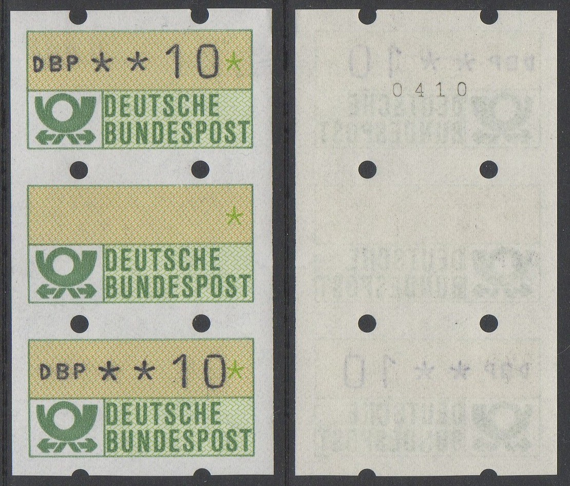 Zu guter Letzt habe ich dann heute noch ein bemerkenswertes Stück der ATM 1 von 1981 bekommen, nämlich einen Dreierstreifen mit oben unten unten je einer 10 Pf-Marke und einem Vordruck ohne Werteindruck!