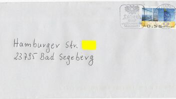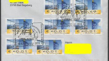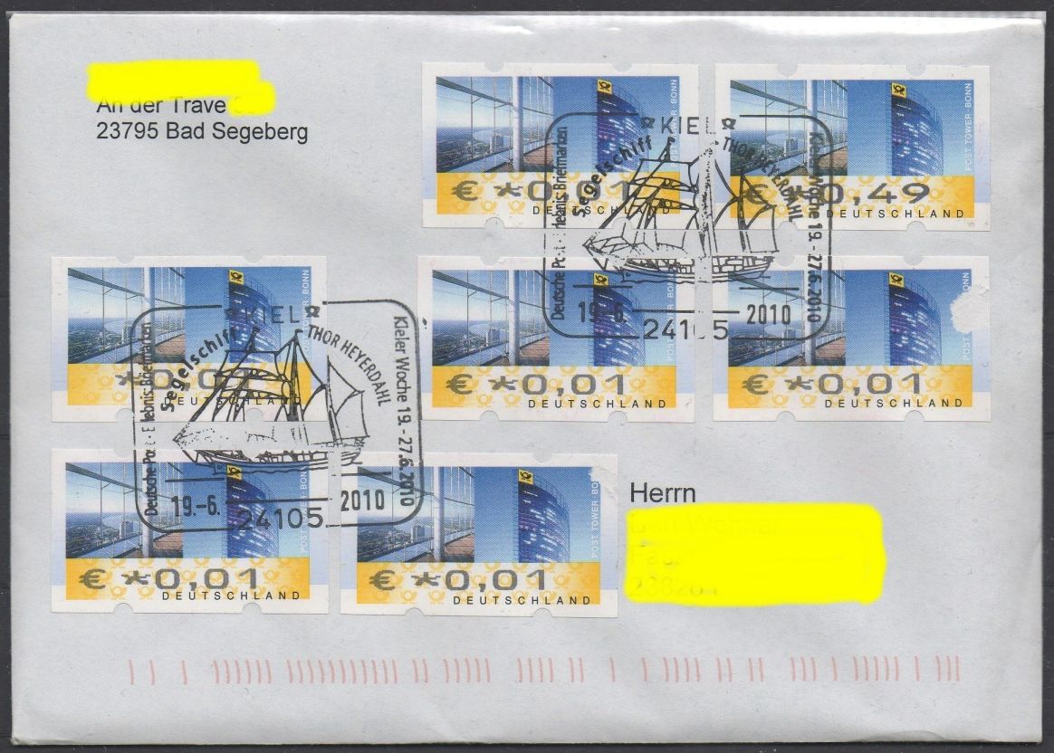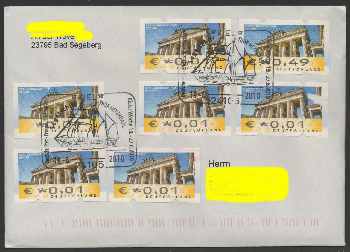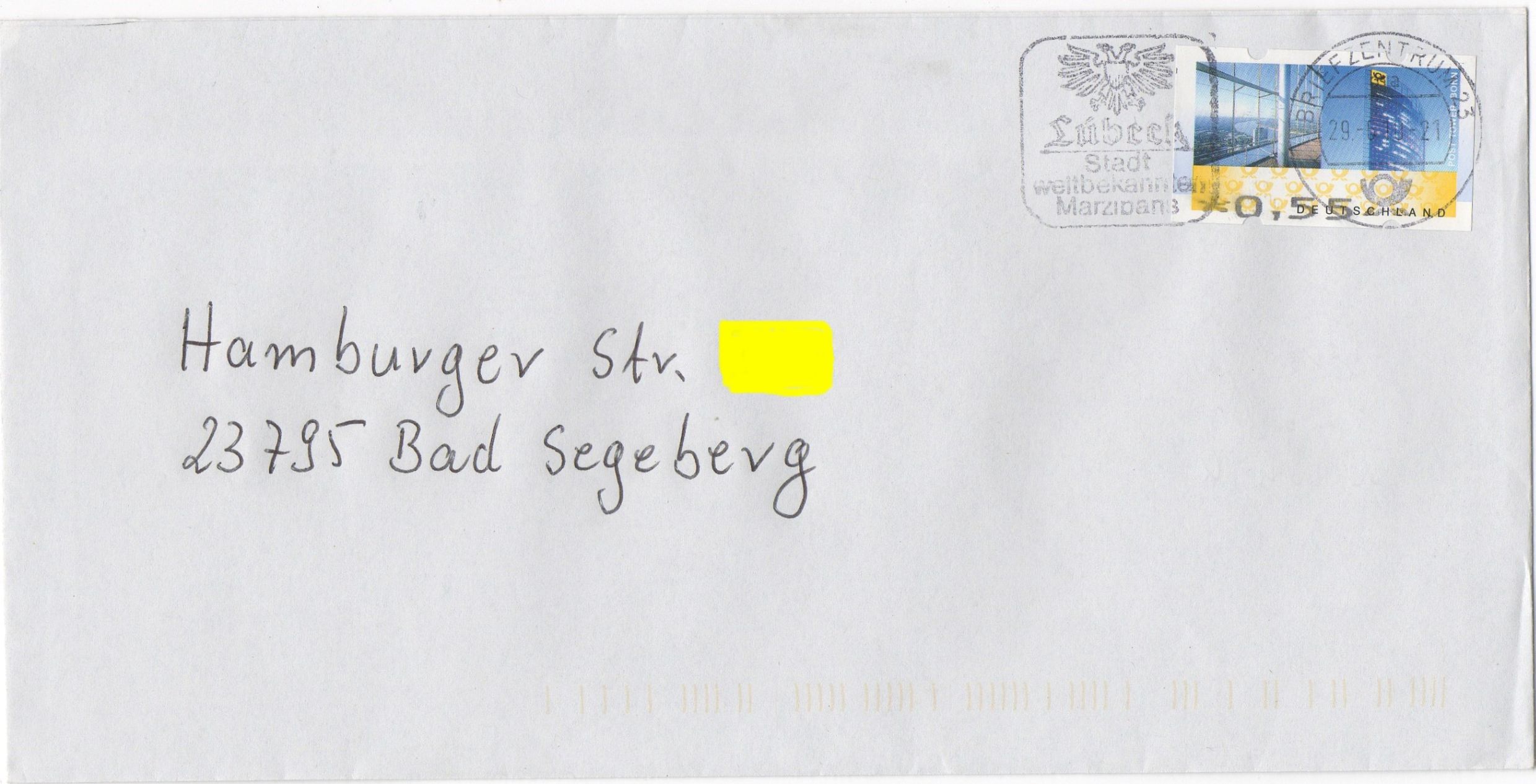Heute hatte ich diesen Brief im DIN-lang-Format mit einer ATM 7 abgestempelt im BZ 23 (Lübeck)! Dies allein ist nicht gerade ungewöhnlich, aber der Wertaufdruck ist extrem weit links!Dieser Brief hatte rückseitig eine Absenderangabe! Wie praktisch...