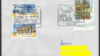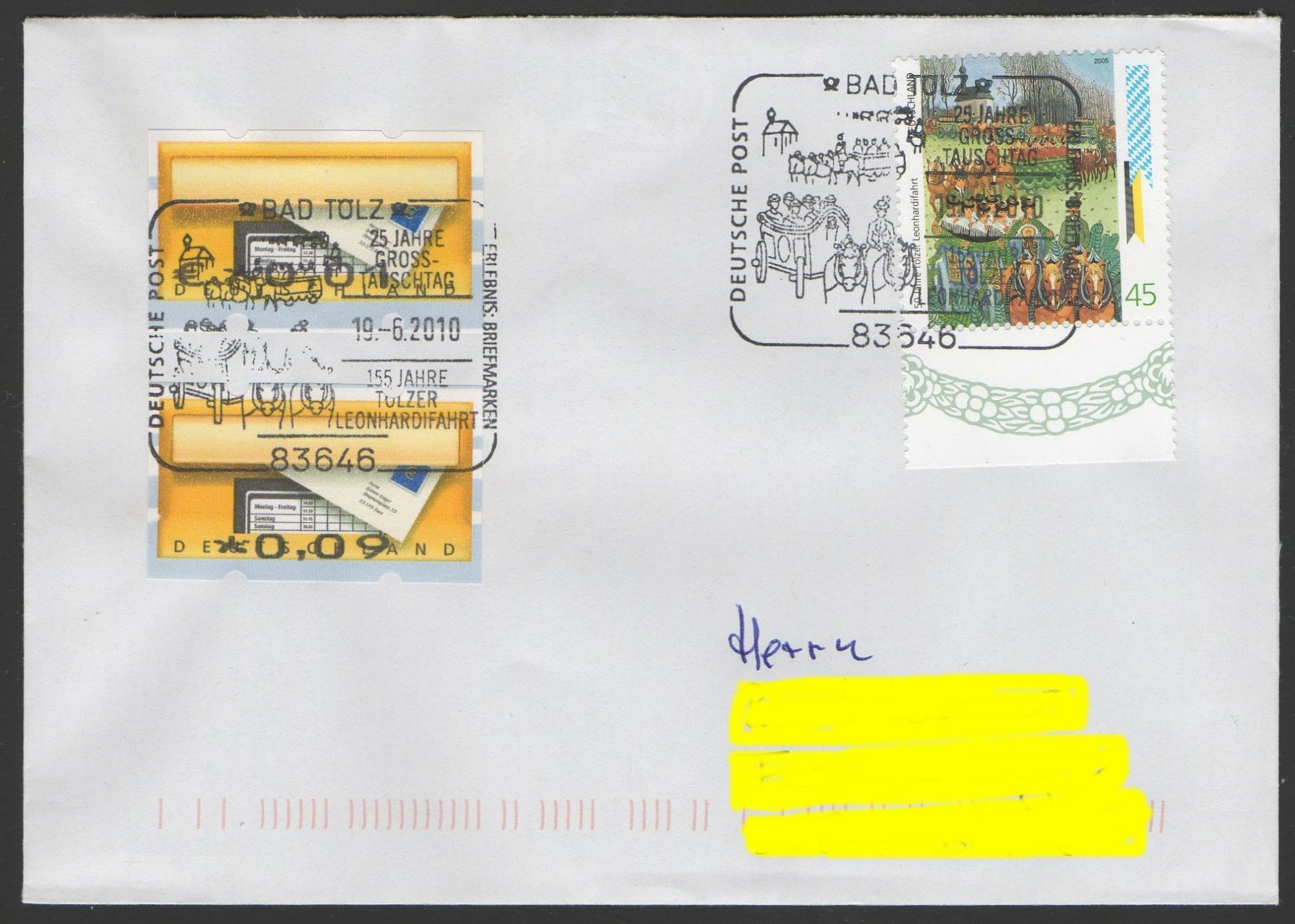 Heute bekam ich aus dem tiefsten Oberbayern diese beiden Briefe mit ATM-Fehlern und Sonderstempel BAD TÖLZ! Bemerkenswert ist aber die passende Marke zu dem Sonderstempel, welche vor fünf Jahren verausgabt wurde, nämlich zur Tölzer Leonhardifahrt 150 Jahre und jetzt der Stempel zum 155. Jubiläum!