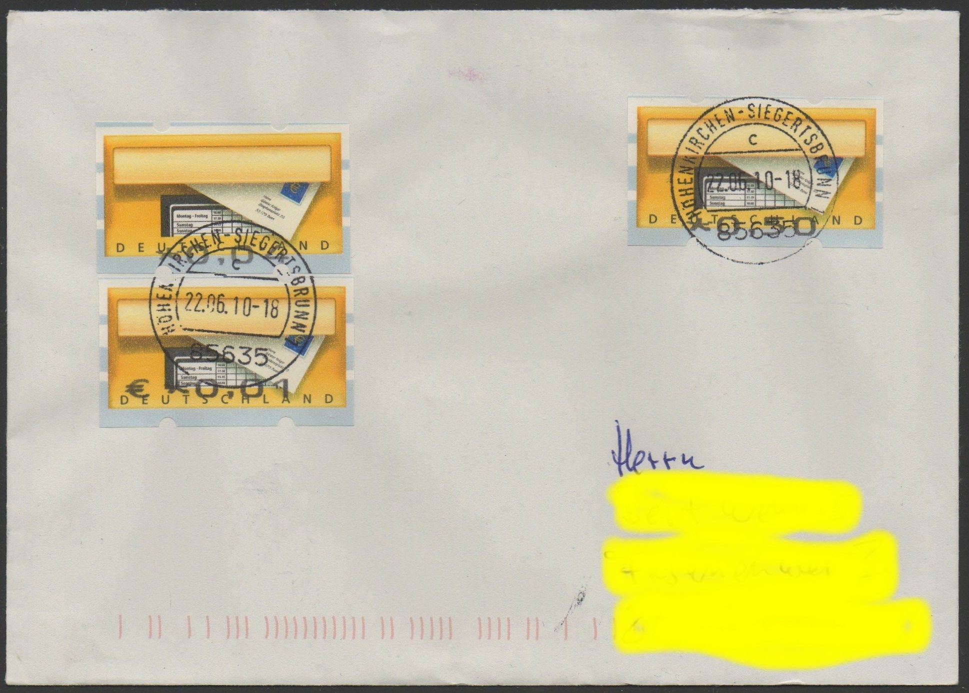 Heute habe ich in meinem Posteingang erneut einen Brief von einem Sammlerfreund aus Bayern vorgefunden. Diesmal mit ATM 5 FI und FII, d.h. ohne und mit €-Zeichen unten!
