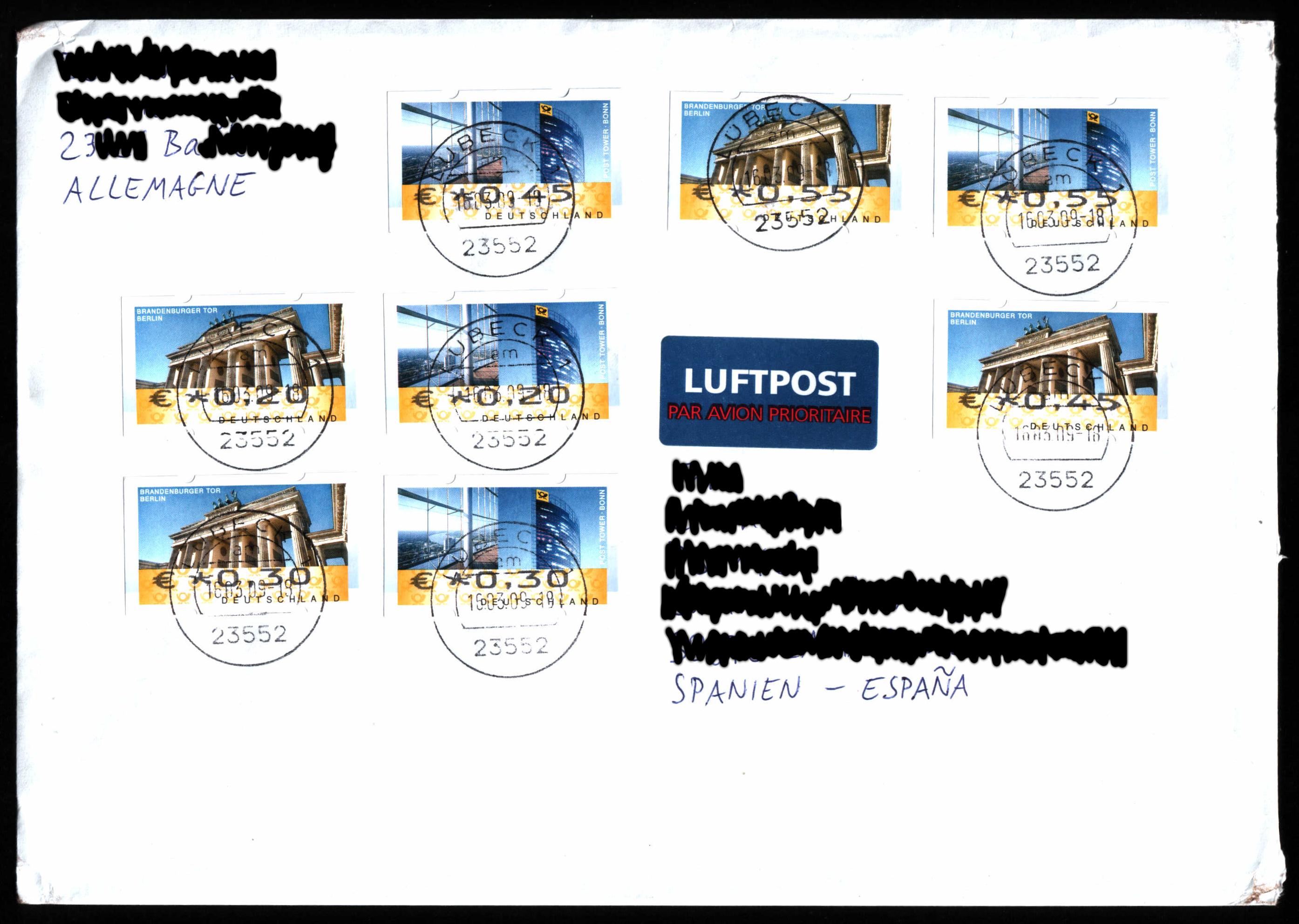 Ich bin an einen Bedarfsbrief, welcher nach Spanien ging (und auch wieder zurück nach Deutschland...), gelangt. Dieser hat die neuen ATM 6 und 7 (nach Michel F II) mit dem Euro-Zeichen. Auch hier kann man erkennen, dass zumindest bei den Aufdrucken mit dem €-Zeichen die Justierung funktioniert hat. Das ist bei allen mir bisher vorliegenden Marken dieser Art so.