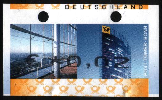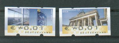 Ich bin an einen Bedarfsbrief, welcher nach Spanien ging (und auch wieder zurück nach Deutschland...), gelangt. Dieser hat die neuen ATM 6 und 7 (nach Michel F II) mit dem Euro-Zeichen. Auch hier kann man erkennen, dass zumindest bei den Aufdrucken mit dem €-Zeichen die Justierung funktioniert hat. Das ist bei allen mir bisher vorliegenden Marken dieser Art so.