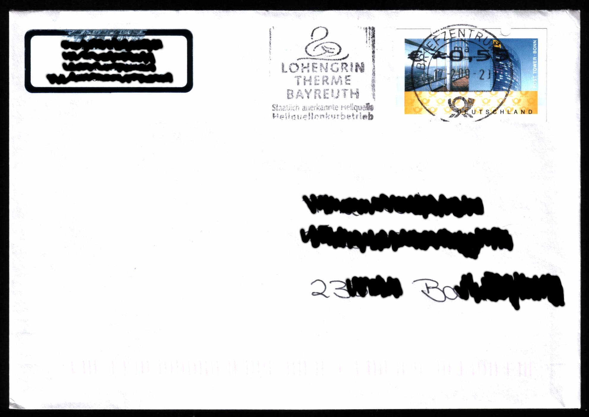 Aus Bayreuth liegt mir auch ein Brief mit einer ATM Fehlverwendung (MiNr. 7 F I) vor, allerdings nur von dem dortigen Briefzentrum. Dennoch ein schöner (Machinen-) Stempelabdruck.