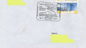 das war doch der Stempel, dessen Datum zunächst nicht feststand, weil es um die Kap-Hoorn-Umfahrung unserer "Gorch Fock" ging, die im südlichsten Hafen der Welt anlegte! Der Stempel trägt das Datum 14.01.2011 war aber am Samstag, 15.01.2011, im "CAP" in Kiel im Einsatz! Ich hatte das zufällig mitbekommen und war dann auch "vor Ort"!!! Bin gerade zurückgeschwommen...