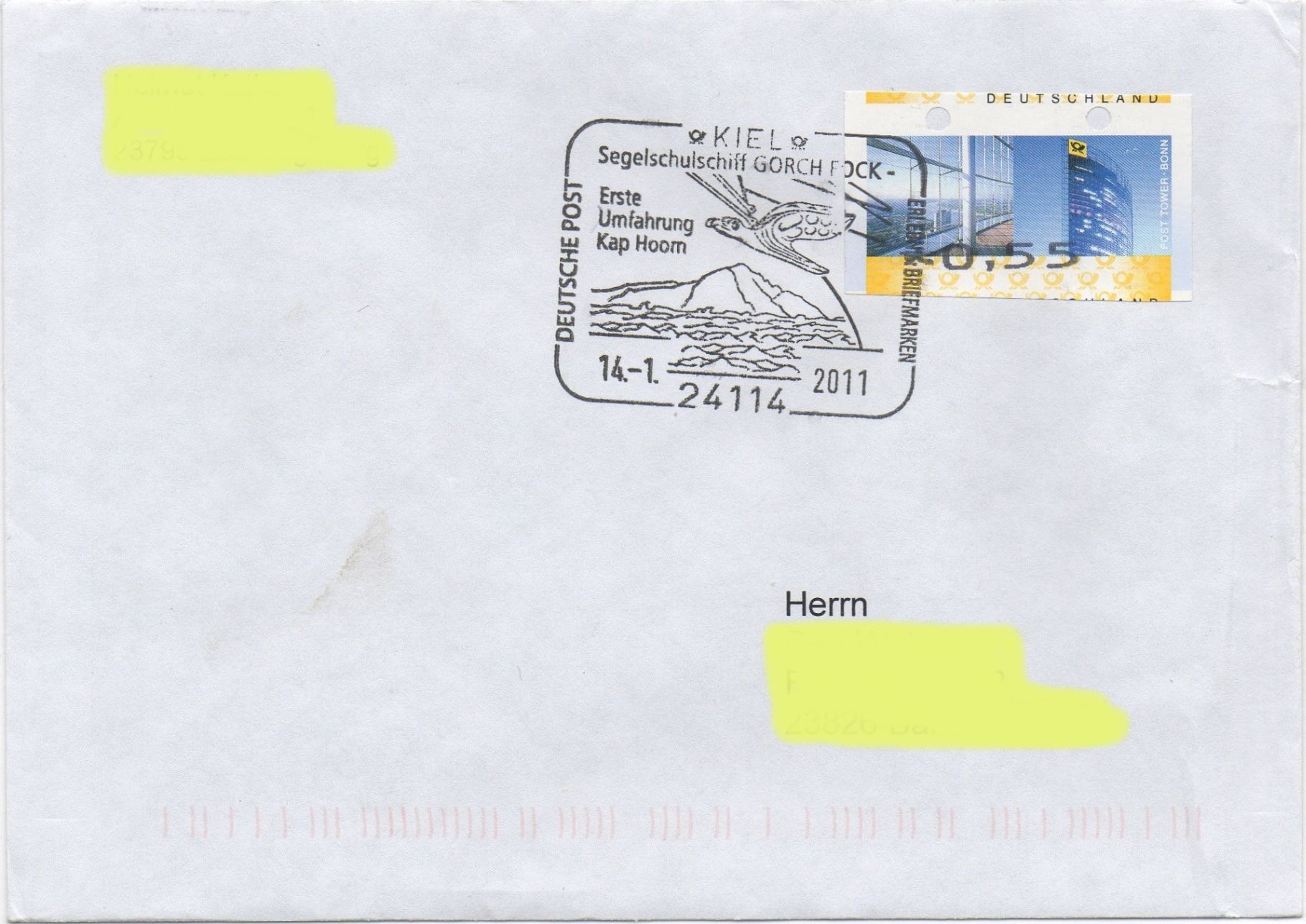 das war doch der Stempel, dessen Datum zunächst nicht feststand, weil es um die Kap-Hoorn-Umfahrung unserer "Gorch Fock" ging, die im südlichsten Hafen der Welt anlegte! Der Stempel trägt das Datum 14.01.2011 war aber am Samstag, 15.01.2011, im "CAP" in Kiel im Einsatz! Ich hatte das zufällig mitbekommen und war dann auch "vor Ort"!!! Bin gerade zurückgeschwommen...