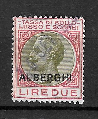 Das ist eine Art von Hotel-Gebührenmarke, die Inschriften übersetzt bedeuten: Hotels (alberghi), Stempelsteuer Luxus und Austausch. Also eine Fiskalmarke, die in keinem Katalog zu finden ist. Auch im Netz findet man fast nichts darüber, nur hier in einem italienschen Briefmarken-Forum, das kann man sich mal mit Google translate übersetzen lassen: