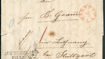 Von mir heute mal "andersrum". Brief aus Ulm, frankiert mit 20 Kreuzer. Postvereinstaxe 9 Kreuzer, russisches internes Porto 11 Kreuzer (3 Sgr.)