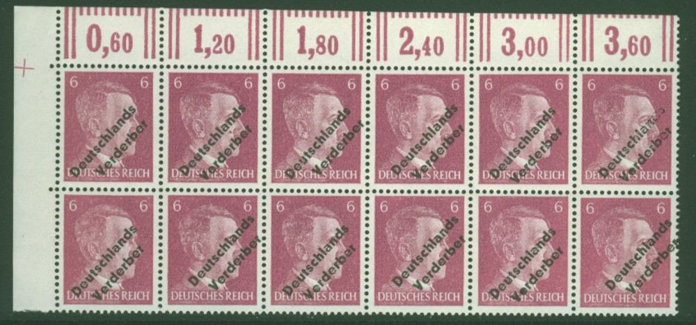 Es finden sich zweimal der Plattenfehler 32 b II "V von VERDERBER unter U in DEUTSCHLANDS" auf den Feldern 1 und 3, dazu der schöne Plattenfehler 32 b IV "senkrechter Strich des D in DEUTSCHLANDS oben abgebrochen" auf Feld 6.
