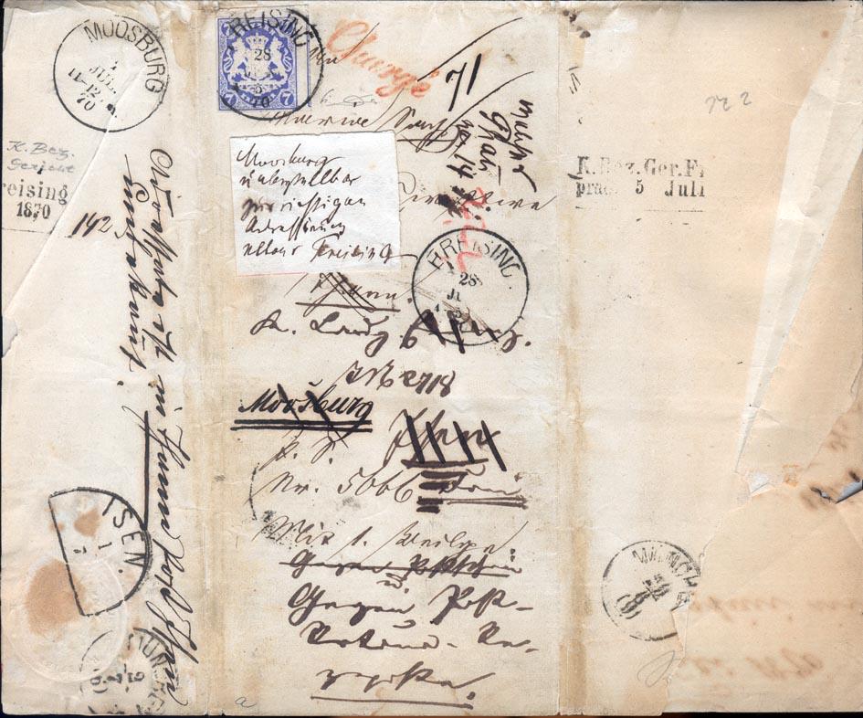 wenn man Post aus, in und durch den Bezirk des ehemaligen Land-/Amtsgerichtes Erding sammelt, stellt man fest, dass die dritte Kategorie ( "durch" ) eigentlich fast nur mit Irrläufern dokumentierbar ist. Um einen solchen handelt es sich hier: Am 28.6.1870 vom Bezirksgericht Freising nach Thann geschickt, kam diese Parteisache am 5.7. wieder am Ausgangspunkt an. Gebräunt, mit Rissen, etwas löchrig und reichlich bekritzelt liegt der große Briefteil heute vor uns - Luxus ist etwas anderes.