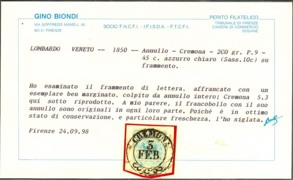 "Ich habe das mit einem gut abgegrenzten Stück frankierte und voll entwertete Briefstück beurteilt; Cremona 5.3 hier unten angeführt. Meiner Meinung nach ist diese entwertete Briefmarke in allen Teilen ein Originalstück. Da diese ausgezeichnet erhalten und im besonders frischen Zustand ist, habe ich sie paraphiert."