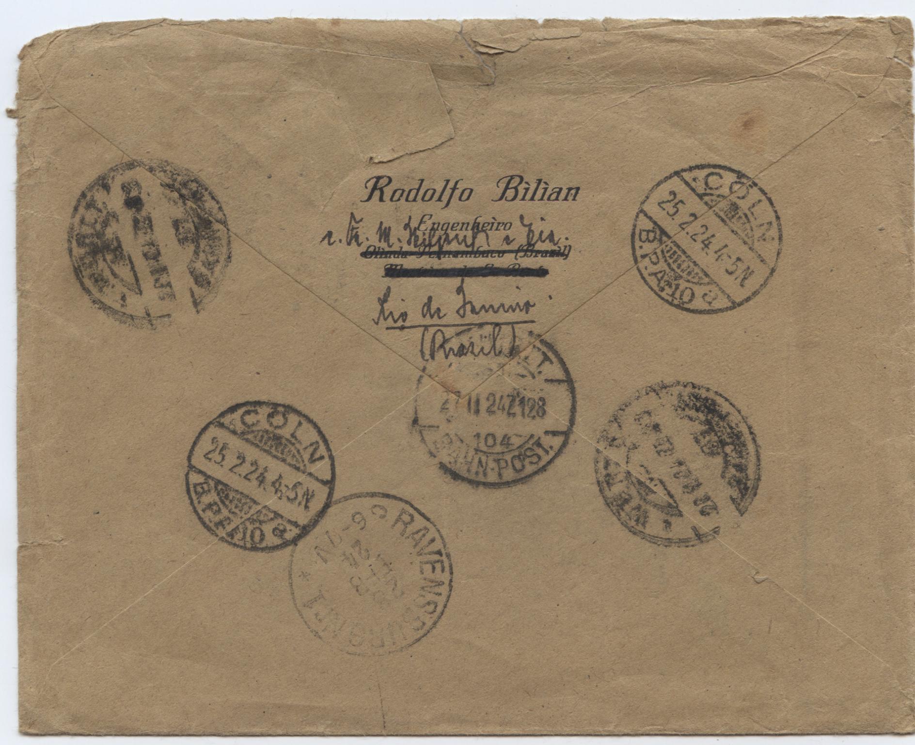 hier mal ein Brief aus Brasilien von 1924 Ortsnamen kann ich leider nicht deuten nach Ravensburg in Württemberg als Einschreiben.